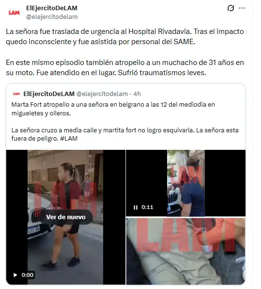 Desde la cuenta de LAM precisaron el episodio de la siguiente manera: «Marta Fort atropello a una señora en Belgrano a las 12 del mediodía en migueletes y olleros. La señora cruzo a media calle y Martita Fort no logro esquivarla. La señora esta fuera de peligro». La publicación estuvo acompañada por videos y material audiovisual del momento posterior al accidente.