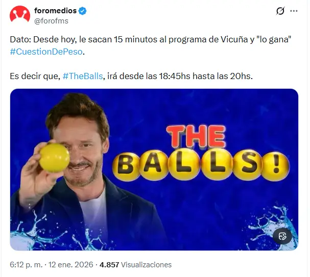La modificación comenzará a aplicarse desde este lunes 12 de enero y altera el esquema horario de la franja. Según la nueva disposición, Cuestión de Peso se verá beneficiado con una extensión en pantalla, mientras que The Balls quedará acotado a un tramo más corto hacia el cierre de la tarde. Esto es debido al bajo nivel de audiencia que viene cosechando el ciclo de Vicuña.