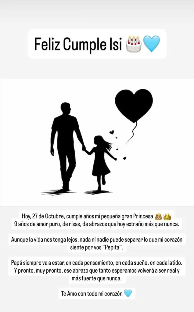 “Feliz cumple Isi. Hoy, 27 de octubre, cumple años mi pequeña gran Princesa. Nueve años de amor puro, de risas, de abrazos que hoy extraño más que nunca”, comenzó expresando el jugador.