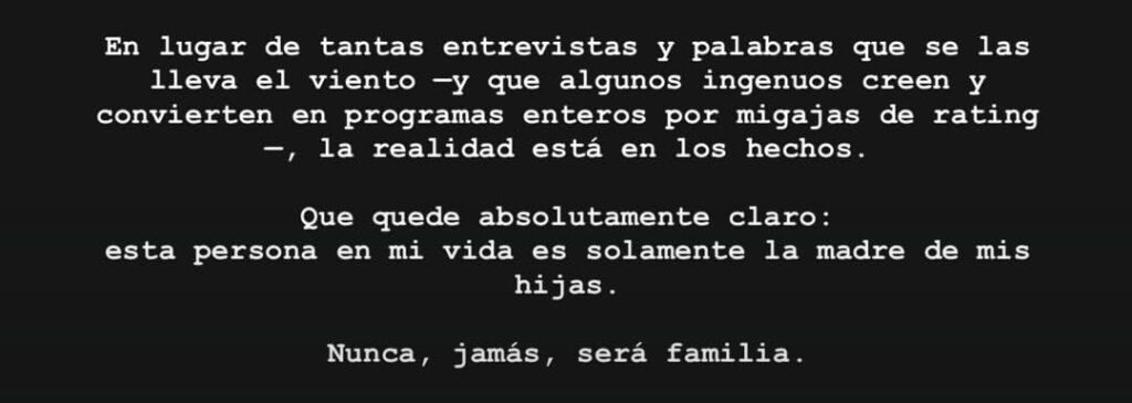 A través de sus redes sociales, el delantero expresó con dureza: “En lugar de tantas entrevistas y palabras que se las lleva el viento la realidad está en los hechos. Que quede absolutamente claro: esta persona en mi vida es solamente la madre de mis hijas. Nunca, jamás, será familia”. El mensaje encendió la mecha y desató una reacción inmediata.