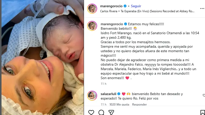 Junto al clip, escribió un mensaje repleto de sensibilidad: “Estamos muy felices. Bienvenido bebito. Isidro Fort Marengo, nació en el Sanatorio Otamendi a las 10:54 am y pesó 2,480 kg. Gracias a todos por los mensajitos hermosos. Siempre me sentí muy acompañada, querida y apoyada por ustedes y no quiero dejarlos afuera de este momento tan mágico”.