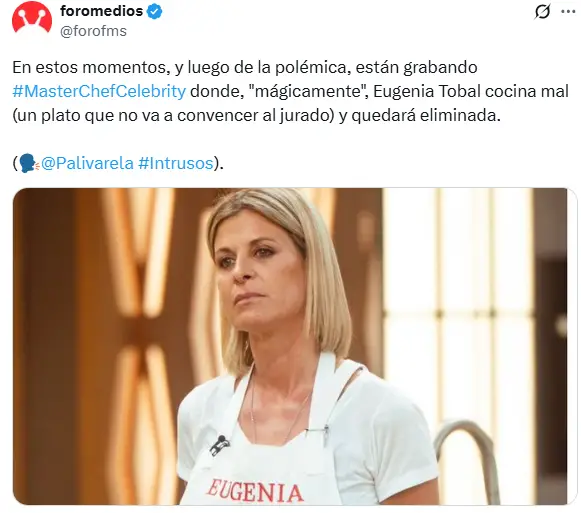 Todo parecía un rumor… hasta que en Intrusos llegó la confirmación. Paula Varela fue directa al revelar que la salida de la actriz ya estaba grabada, pero no como muchos imaginaban, sino como una especie de escena preparada específicamente para justificar su partida. En palabras de la panelista: “Atención, porque en este mismo momento se está grabando la despedida de Eugenia. Ella hace un plato y no gusta. No renuncia como Valentina Cervantes, la descalifican porque cocinó mal”. Y remató sin vueltas: “Es una eliminación guionada”.