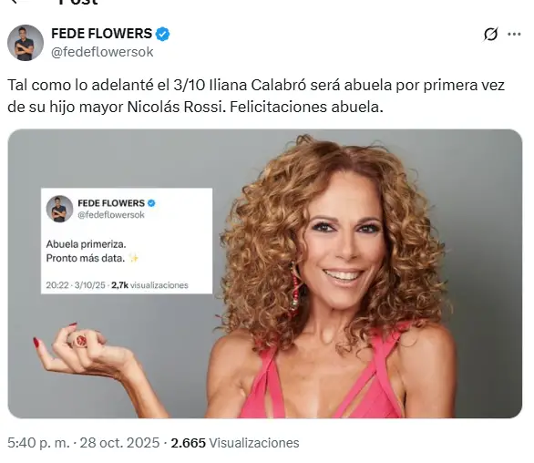 La primicia fue compartida por Fede Flowers, y Laura Ubfal amplió detalles: “De hecho la primicia fue de Fede Flowers, quien comunicó la noticia en sus redes. Nicolás Rossi está casado con una joven brasileña llamada Bárbara, nuera de Iliana Calabró y el bebé nacerá hacia enero”, indicó la panelista de Infama.
