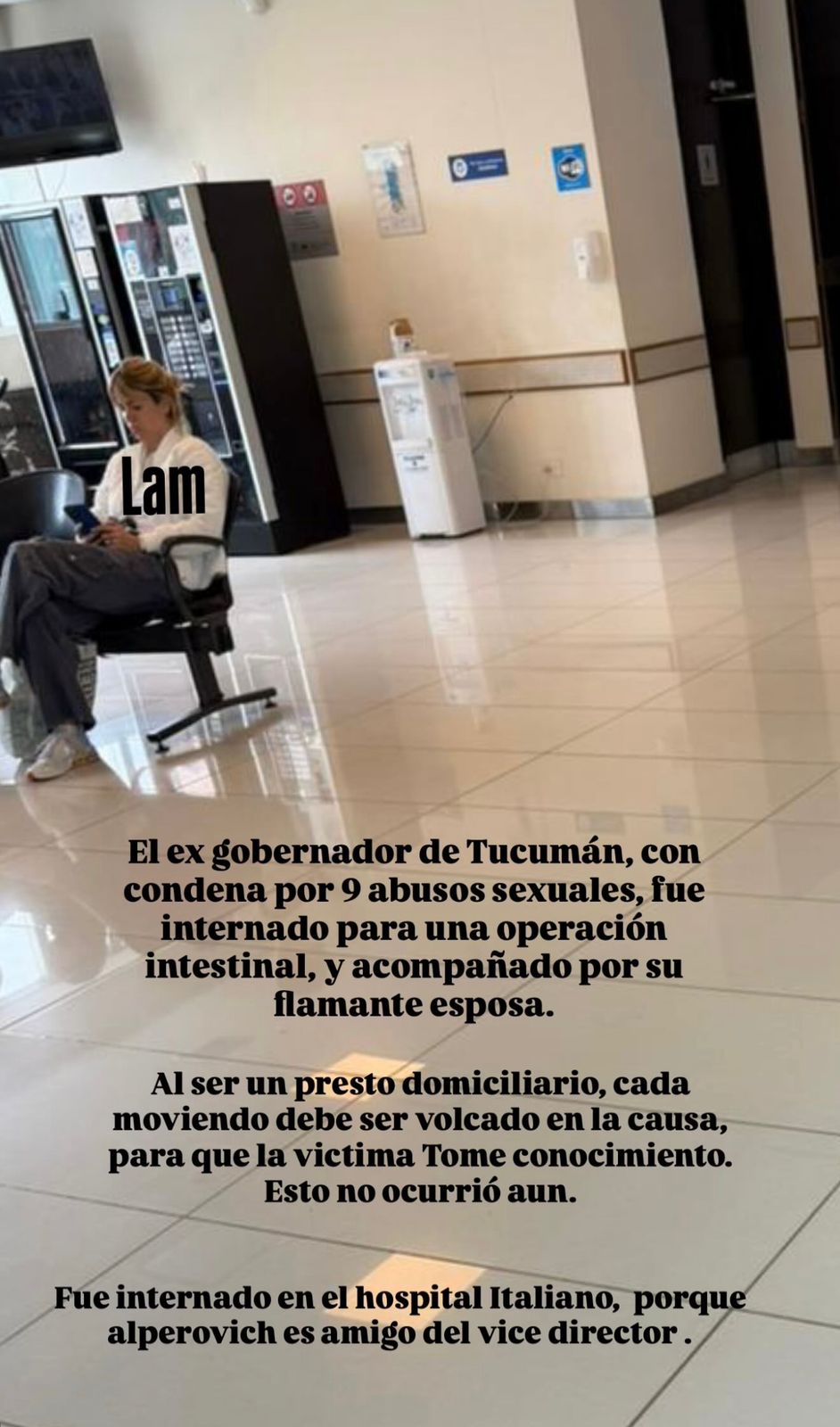 Ángel de Brito amplió la información a través de sus redes, donde contó que «El ex gobernador de Tucumán, con condena por 9 abusos sexuales, fue internado para una operación intestinal, y acompañado por su flamante esposa». En ese contexto, el conductor explicó también que, por tratarse de un arresto domiciliario, «cada moviendo debe ser volcado en la causa, para que la victima Tome conocimiento. Esto no ocurrió aun», generando así un nuevo foco de atención alrededor del caso.