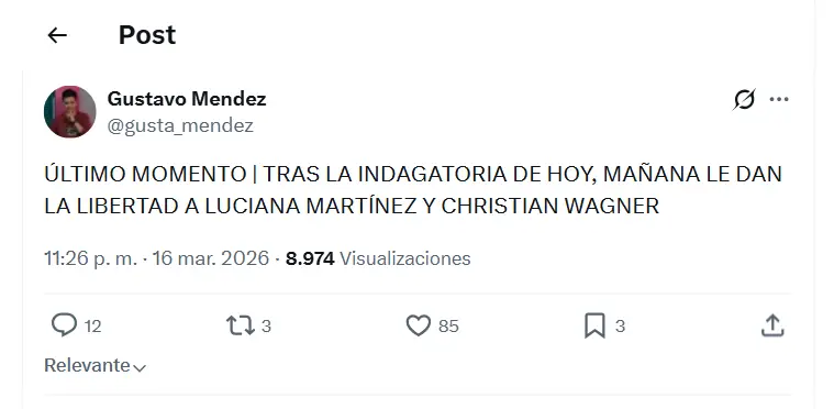 En medio de este escenario cargado de incertidumbre, el periodista Gustavo Méndez aportó una información que podría marcar un giro en la causa: “ÚLTIMO MOMENTO | TRAS LA INDAGATORIA DE HOY, MAÑANA LE DAN LA LIBERTAD A LUCIANA MARTÍNEZ Y CHRISTIAN WAGNER”.