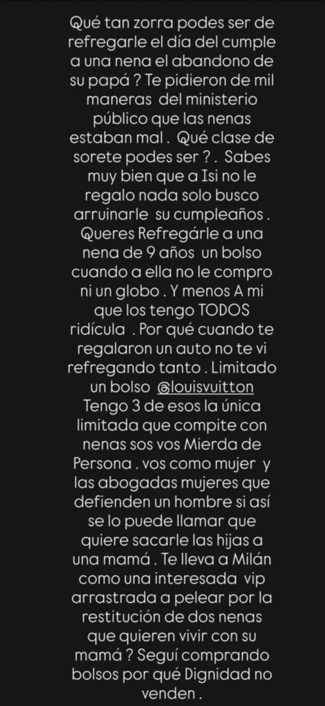 Visiblemente afectada por lo que consideró una provocación hacia su hija, continuó con un mensaje aún más fuerte: Sabés muy bien que a Isi no le regaló nada, solo buscó arruinarle su cumpleaños. Querés refregarle a una nena de 9 años un bolso cuando a ella no le compró ni un globo