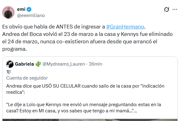 No obstante, tras la viralización del clip, otros usuarios intentaron aportar contexto y bajarle el tono a la polémica. En respuesta al tuit viral, varios seguidores del programa señalaron: “Es obvio que habla de ANTES de ingresar a #GranHermano. Andrea del Boca volvió el 23 de marzo a la casa y Kennys fue eliminado el 24 de marzo, nunca co-existieron afuera desde que arrancó el programa”.