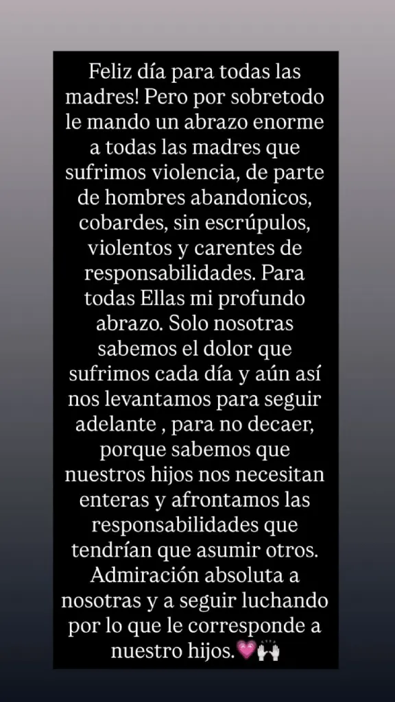 Fiel a su estilo directo, Luciana Salazar también reflexionó sobre la fortaleza de las madres que crían solas, y cómo, a pesar del dolor, continúan adelante por el bienestar de sus hijos. En ese sentido, expresó: «Solo nosotras sabemos el dolor que sufrimos cada día. Y aun así nos levantamos para seguir adelante, para no decaer. Porque sabemos que nuestros hijos nos necesitan enteras y afrontamos las responsabilidades que tendrían que asumir otros. Admiración absoluta a nosotras y a seguir luchando por lo que le corresponde a nuestros hijos».