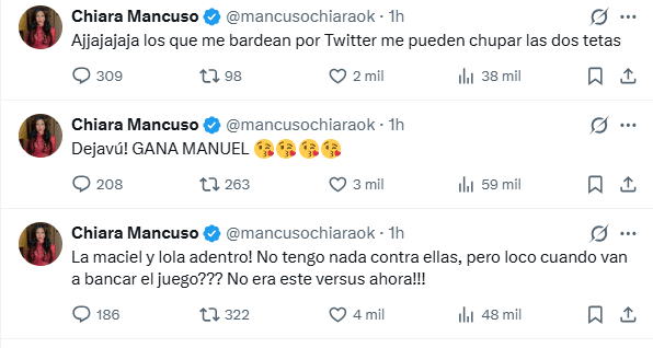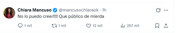 Una de las reacciones que más ruido generó fue la de Chiara Mancuso, ex participante de la edición anterior, quien no ocultó su frustración tras conocer el resultado de la gala. Apenas terminó el programa, compartió un mensaje que rápidamente se viralizó: “No lo puedo creer!!!! Qué público de mier…”.