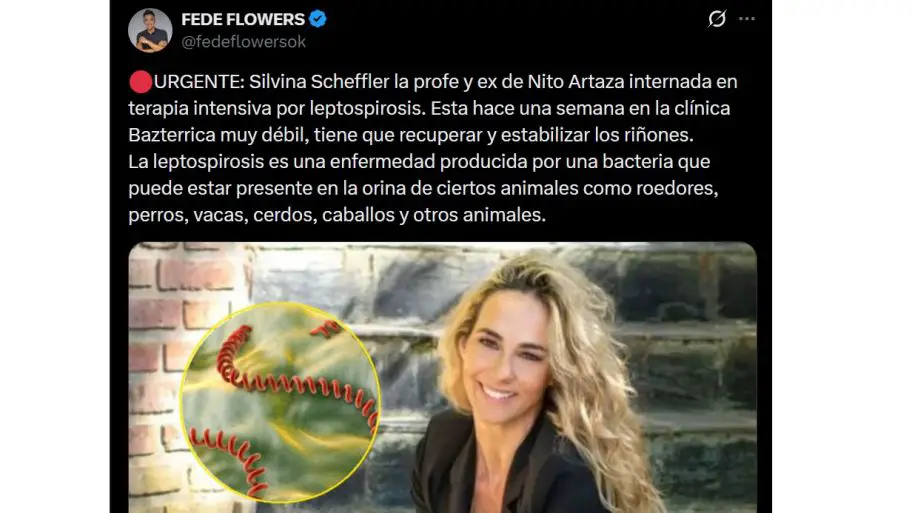 En su mensaje, el periodista fue contundente y encendió las alarmas al revelar: “La profe y ex de Nito Artaza está internada en terapia intensiva por leptospirosis. Hace una semana que se encuentra en la Clínica Bazterrica, muy débil, y debe recuperar y estabilizar los riñones”. La frase generó un fuerte impacto tanto en el público como en colegas del medio, que rápidamente se solidarizaron con la ex Gran Hermano.