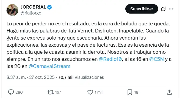 Mientras tanto, un sector de las redes esperaba con ansiedad las declaraciones de Rial. Tal como ocurrió cuando La Libertad Avanza perdió en Buenos Aires el pasado 7 de septiembre y muchos lo señalaron como responsable de esa derrota, esta vez miles de usuarios aguardaban su reacción “con cuchillo y tenedor” para verlo “derrotado”.