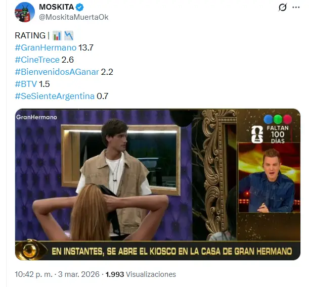 Sin embargo, mientras en la casa se definen estrategias, afuera el foco también está puesto en los números de audiencia. Si bien el reality mantiene un promedio competitivo, volvió a darse un escenario que llamó la atención: otro ciclo logró superarlo y quedarse con el pico más alto del martes 3 de marzo.