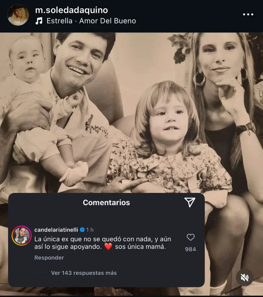 En este contexto, Candelaria Tinelli decidió romper el silencio y sumarse al huracán mediático. Fiel a su estilo frontal, la hija de Marcelo salió a defender públicamente a su madre y lanzó una dura indirecta contra las otras ex de su padre, Guillermina Valdés y Paula Robles. Todo comenzó cuando comentó una publicación de Soledad Aquino, escribiendo: “La única ex que no se quedó con nada y aún así lo sigue apoyando. Sos única mamá”.