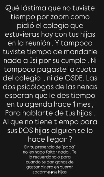 Lejos de quedarse ahí, la conductora continuó con un nuevo mensaje: “Las dos psicólogas de las nenas esperan hace un mes que les des tiempo en tu agenda. Sin tu presencia de ‘papá’ no les hago faltar nada. Te lo recuerdo solo cuando te dan ganas de gastar dinero en querer sacarme a mis hijas”.