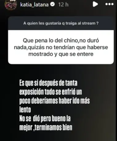 En otro mensaje, un seguidor deslizó una autocrítica que ella no dudó en compartir: “Quizás no se tendrían que haber mostrado…”. Katia coincidió y reconoció que la exposición temprana terminó jugando en contra: “Es que sí, después de tanta exposición, todo se enfrió un poco. Deberíamos haber ido más lento”. Aun así, aclaró que el cierre fue en buenos términos: “No se dio, pero bueno, la mejor, terminamos bien”.