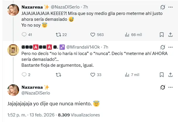 Sin embargo, la respuesta de la periodista no tardó en llegar. Lejos de quedarse callada, salió a despegarse de la versión con una frase que llamó la atención: “Mirá que soy medio gila, pero meterme ahí justo sería demasiado”. Y para que no quedaran dudas, remató: “Yo no soy”.