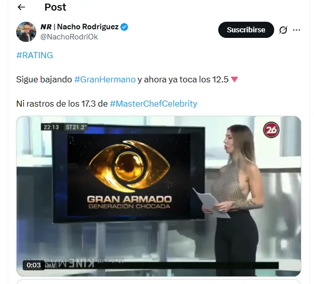 Según informó el periodista Nacho Rodríguez, este miércoles se vio una situación que encendió las alarmas: MasterChef Celebrity, con la primera parte de la final, alcanzó un pico de 17.3 puntos de rating. Sin embargo, minutos después, Gran Hermano cayó rápidamente a 12.5 puntos, lo que representa una pérdida de casi 5 puntos en muy poco tiempo.