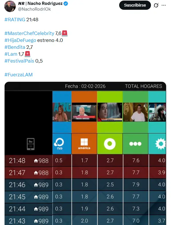 A las 21:48, los números reflejaron: MasterChef Celebrity 7,2 frente a Hija De Fuego 3,7. Minutos más tarde, el reality volvió a estirarse: MasterChef Celebrity 7,6, mientras que Hija De Fuego 4.0 alcanzó su mejor marca de la noche.