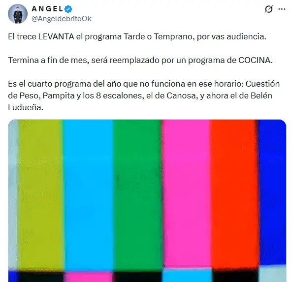 La salida de Tarde o Temprano abrió inmediatamente la puerta a nuevas propuestas dentro de la señal. El periodista Ángel de Brito confirmó a través de X cuál será el reemplazo: “El Trece LEVANTA el programa Tarde o Temprano, por baja audiencia. Termina a fin de mes y será reemplazado por un programa de cocina”. Por el momento, no se conocen más detalles sobre el formato, el nombre ni quién estará al frente de esta apuesta culinaria, pero todo indica que el canal busca renovar su oferta y captar a un público distinto.