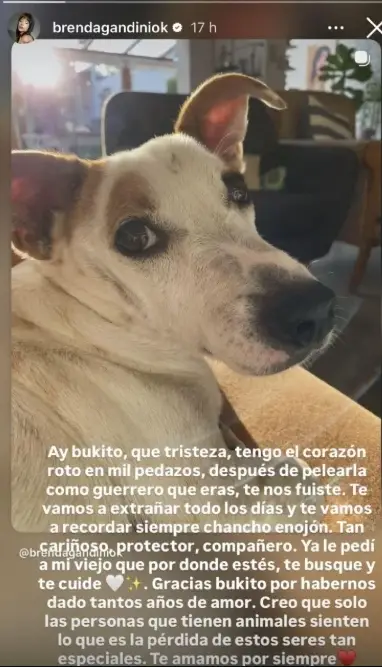 En su mensaje, Brenda también destacó el lugar único que Bukito ocupaba dentro de la familia y el vacío que deja su ausencia. “Te vamos a extrañar todos los días y te vamos a recordar siempre chancho enojón. Tan cariñoso, protector, compañero. Ya le pedí a mi viejo que por donde estés, te busque y te cuide”, escribió, dejando ver la mezcla de dolor, amor y espiritualidad que atraviesa este momento.