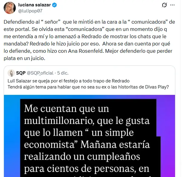 Todo se desató cuando desde la cuenta del programa de Yanina Latorre publicaron un mensaje que apuntaba directamente contra Salazar, en tono crítico y filoso: “Luli Salazar se queja por el festejo a todo trapo de Redrado. ¿Tendrá algún tema para hablar que no sea su ex o las historias de Divas Play?”.