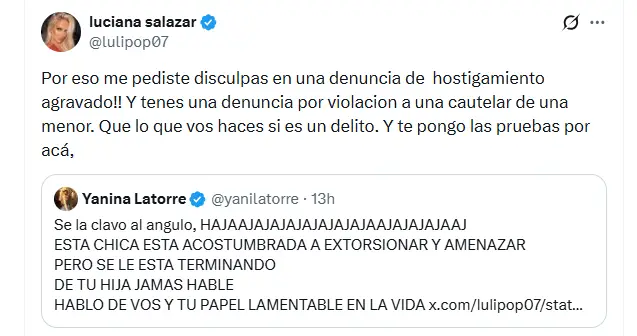 Finalmente, Yanina cerró con una frase que volvió a encender la polémica y dejó en claro que no piensa bajar el tono del conflicto: “‘Se la clavo al ángulo’ JAJAJAJAJAJA. Esta chica está acostumbrada a extorsionar y amenazar pero se le está terminando. De tu hija jamás hablé, hablo de tu vida y tu lamentable papel en la vida”. Sin embargo, Luciana continuó: “Por eso me pediste disculpas en una denuncia de hostigamiento agravado!! Y tenes una denuncia por violación a una cautelar de una menor. Que lo que vos haces si es un delito. Y te pongo las pruebas por acá”