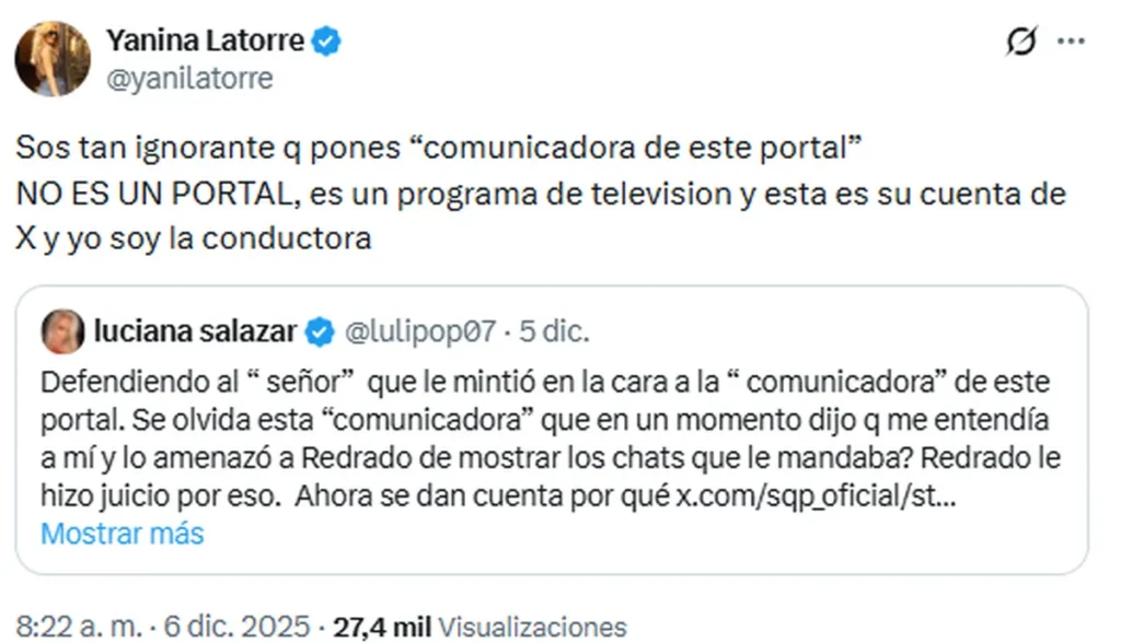 Horas más tarde, Yanina Latorre salió con los tapones de punta y respondió punto por punto, sin suavizar una sola palabra. Primero, lanzó: “Sos tan ignorante que pones ‘comunicadora de este portal’. No es un portal, es un programa de televisión y esta es su cuenta de X y yo soy la conductora”.