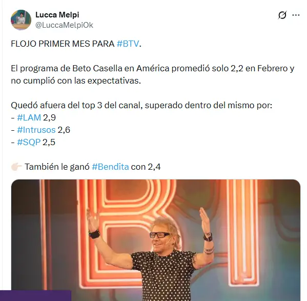 Exactamente, Lucca Melpi dijo: “FLOJO PRIMER MES PARA BTV. El programa de Beto Casella en América promedió solo 2,2 en Febrero y no cumplió con las expectativas. Quedó afuera del top 3 del canal, superado dentro del mismo por: LAM 2,9, Intrusos 2,6, SQP 2,5. También le ganó Bendita con 2,4“.